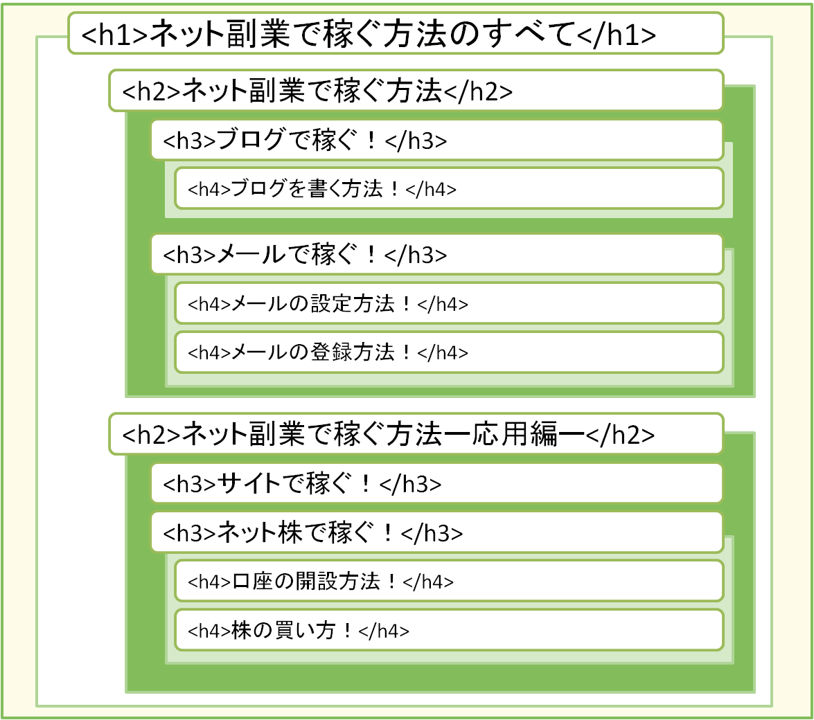 上の「h1」、「h2」などはHTMLの見出しダグと呼ばれるもので、図のように文字を囲むことで、この文は見出しですよということを検索エンジンに伝えます。数字が小さい方が大きい見出しという意味で、検索エンジンにもより重要な見出しである事を伝えるます。